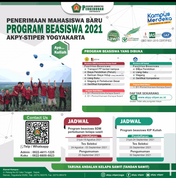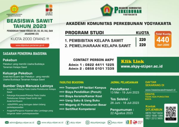 Tahun akademik 2021/2022 Akademi Komunitas perkebunan yogyakarta dipercaya untuk menyelenggarakan 2 program beasiswa diantaranya; Program beasiswa SDM perkebunan kelapa sawit dan beasiswa KIP kuliah.