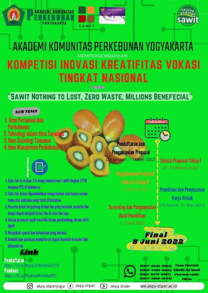 Bersamaan dengan berakhirnya Learning Factory di Kebun Pendidikan dan Penelitian Ungaran pada 24 April 2021 kabar membanggakan hadir dari mahasiswa AKPY yang mengikuti kompetisi Agile (AKIA Global Invention Leaders Award) 2021 yang diselenggarakan oleh Yayasan Aku Indonesia. Akademi Komunitas Perkebunan Yogyakarta diwakili 2 tim yang lolos di Grand Final dengan judul inovasi :