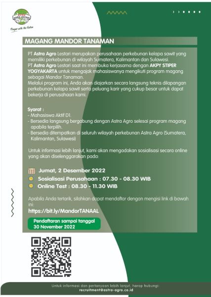 Akademi Komunitas Perkebunan Yogyakarta (AKPY-STIPER) membuka kesempatan berkarir bagi Tenaga Profesional sebagai Tenaga Pengajar (Dosen) dan Karyawan dengan kualifikasi sebagai berikut